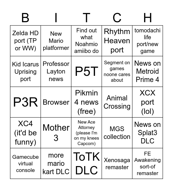 This bingo card has a free space and 24 words: Mother 3, more mario kart DLC, P5T, Gamecube virtual console, tomodachi life port/new game, Zelda HD port (TP or WW), Kid Icarus Uprising port, New Mario platformer, Animal Crossing, New Ace Attorney (please I'm on my knees Capcom), Segment on games noone cares about, P3R, MGS collection, News on Splat3 DLC, Professor Layton news, Xenosaga remaster, XCX port (lol), Find out what Noahmio amiibo do, News on Metroid Prime 4, Browser, FE Awakening sort-of remaster, XC4 (it'd be funny), Rhythm Heaven port and ToTK DLC.