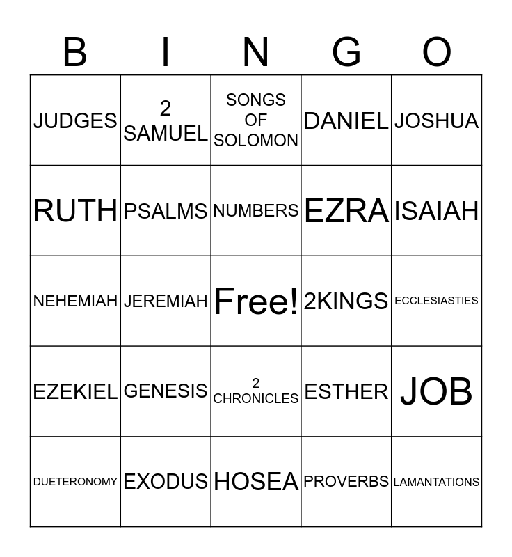 This bingo card has a free space and 24 words: GENESIS, EXODUS, NUMBERS, DUETERONOMY, JOSHUA, JUDGES, RUTH, 2 SAMUEL, 2KINGS, 2 CHRONICLES, EZRA, NEHEMIAH, ESTHER, JOB, PSALMS, PROVERBS, ECCLESIASTIES, SONGS OF SOLOMON, ISAIAH, JEREMIAH, LAMANTATIONS, EZEKIEL, DANIEL and HOSEA.