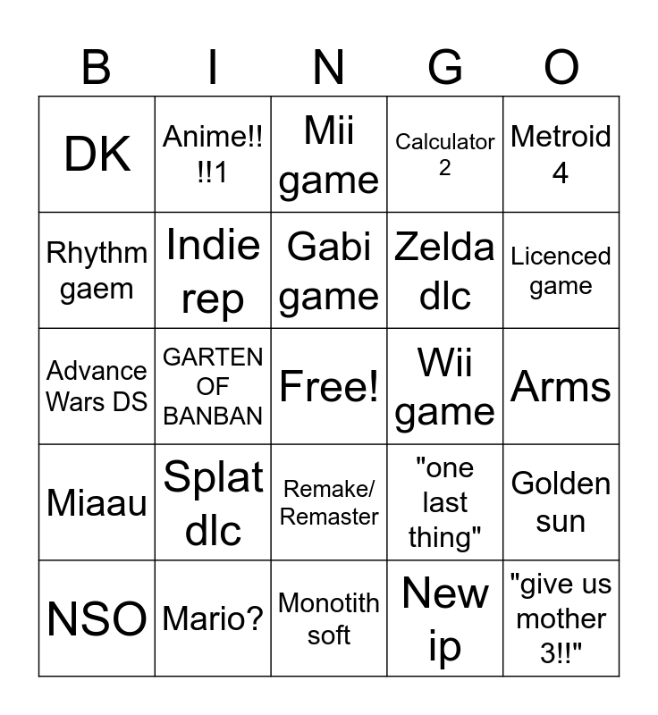 This bingo card has a free space and 24 words: Splat dlc, Mario?, Gabi game, NSO, Metroid 4, DK, Rhythm gaem, Anime!! !!1, Wii game, Remake/ Remaster, Zelda dlc, Advance Wars DS, "one last thing", Golden sun, Indie rep, New ip, Arms, Mii game, Licenced game, GARTEN OF BANBAN, "give us mother 3!!", Miaau, Calculator 2 and Monotith soft.