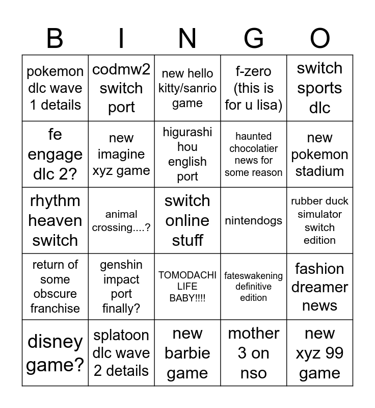 This bingo card has a free space and 24 words: genshin impact port finally?, splatoon dlc wave 2 details, higurashi hou english port, disney game?, switch sports dlc, pokemon dlc wave 1 details, fe engage dlc 2?, codmw2 switch port, nintendogs, TOMODACHI LIFE BABY!!!!, haunted chocolatier news for some reason, rhythm heaven switch, fateswakening definitive edition, fashion dreamer news, new imagine xyz game, mother 3 on nso, rubber duck simulator switch edition, new hello kitty/sanrio game, new pokemon stadium, animal crossing....?, new xyz 99 game, return of some obscure franchise, f-zero (this is for u lisa) and new barbie game.