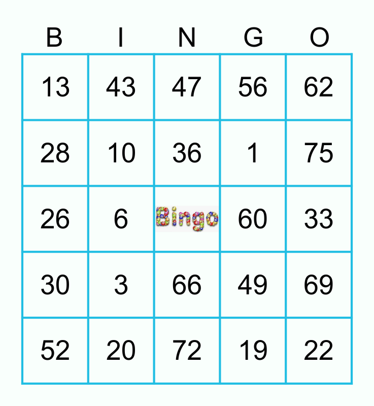This bingo card has a free space and 24 words: 3, 20, 36, 52, 62, 13, 28, 43, 60, 66, 1, 26, 49, 69, 10, 19, 33, 47, 75, 6, 22, 30, 56 and 72.