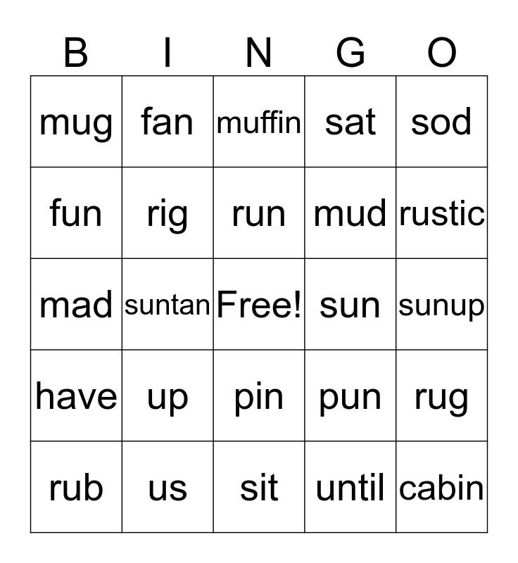 This bingo card has a free space and 24 words: up, us, run, rub, sod, mug, fun, fan, sun, pin, mud, mad, pun, rug, rig, until, sunup, muffin, rustic, suntan, cabin, have, sat and sit.