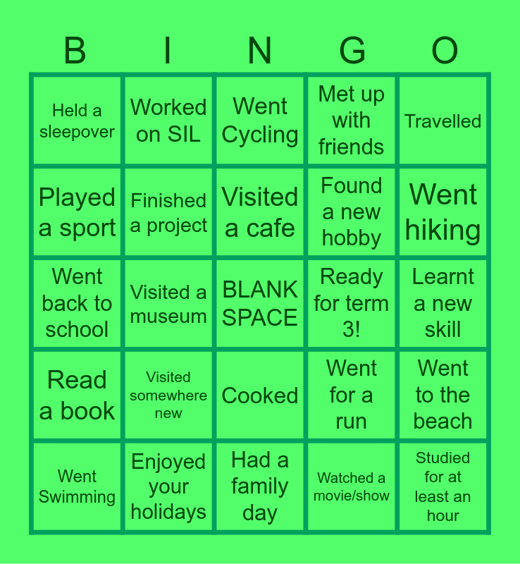 This bingo card has a free space and 24 words: Went Swimming, Visited somewhere new, Visited a cafe, Watched a movie/show, Travelled, Held a sleepover, Worked on SIL, Went Cycling, Ready for term 3!, Learnt a new skill, Went back to school, Finished a project, Went for a run, Went to the beach, Played a sport, Enjoyed your holidays, Had a family day, Met up with friends, Went hiking, Read a book, Visited a museum, Cooked, Found a new hobby and Studied for at least an hour.