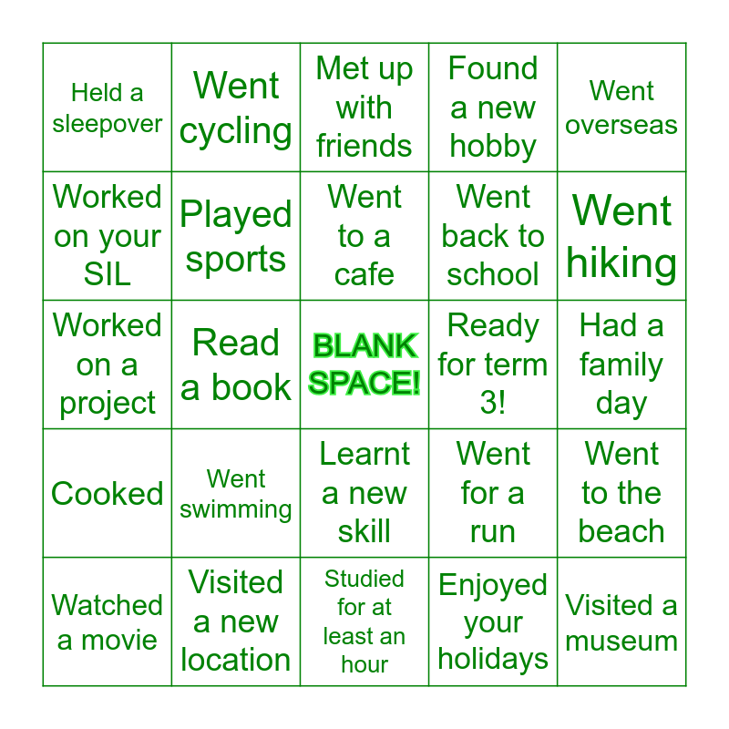 This bingo card has a free space and 24 words: Went swimming, Visited a new location, Went to a cafe, Watched a movie, Went overseas, Held a sleepover, Worked on your SIL, Went cycling, Ready for term 3!, Learnt a new skill, Went back to school, Worked on a project, Went for a run, Went to the beach, Played sports, Enjoyed your holidays, Had a family day, Met up with friends, Went hiking, Read a book, Visited a museum, Cooked, Found a new hobby and Studied for at least an hour.