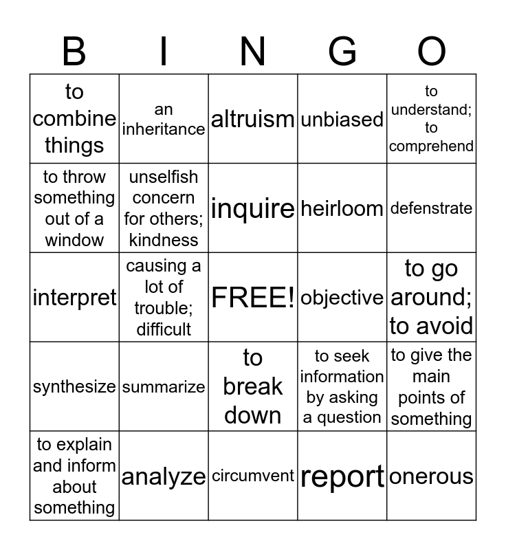 This bingo card has a free space and 24 words: summarize, analyze, inquire, to explain and inform about something, to understand; to comprehend, to combine things, to throw something out of a window, an inheritance, objective, to break down, heirloom, interpret, to seek information by asking a question, to give the main points of something, unselfish concern for others; kindness, report, to go around; to avoid, altruism, defenstrate, causing a lot of trouble; difficult, onerous, synthesize, unbiased and circumvent.