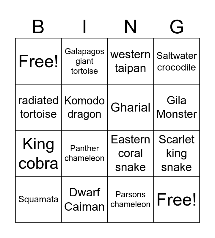 This bingo card has 20 words: Scarlet king snake, Aligator, western taipan, Leatherback sea turtle, Squamata, radiated tortoise, Dwarf Caiman, Free!, King cobra, Galapagos giant tortoise, Panther chameleon, Eastern coral snake, Komodo dragon, Free!, Gharial, Common garter snake, Gila Monster, Saltwater crocodile, Parsons chameleon and Chelonia.