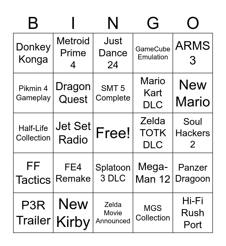 This bingo card has a free space and 24 words: FE4 Remake, New Kirby, SMT 5 Complete, P3R Trailer, ARMS 3, Donkey Konga, Pikmin 4 Gameplay, Metroid Prime 4, Zelda TOTK DLC, Splatoon 3 DLC, Mario Kart DLC, Half-Life Collection, Mega-Man 12, Panzer Dragoon, Dragon Quest, MGS Collection, Soul Hackers 2, Just Dance 24, New Mario, Jet Set Radio, Hi-Fi Rush Port, FF Tactics, GameCube Emulation and Zelda Movie Announced.