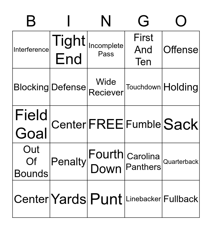 This bingo card has a free space and 24 words: Penalty, Yards, Wide Reciever, Center, Offense, Interference, Blocking, Tight End, Fumble, Fourth Down, Touchdown, Field Goal, Carolina Panthers, Quarterback, Defense, Linebacker, Sack, Incomplete Pass, Holding, Center, Fullback, Out Of Bounds, First And Ten and Punt.