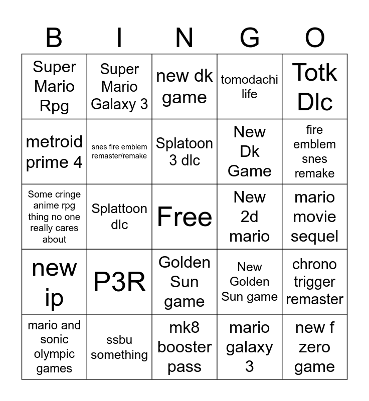 This bingo card has a free space and 24 words: P3R, ssbu something, Splatoon 3 dlc, mario and sonic olympic games, Totk Dlc, Super Mario Rpg, metroid prime 4, Super Mario Galaxy 3, New 2d mario, Golden Sun game, New Dk Game, Some cringe anime rpg thing no one really cares about, New Golden Sun game, chrono trigger remaster, snes fire emblem remaster/remake, mario galaxy 3, mario movie sequel, new dk game, fire emblem snes remake, Splattoon dlc, new f zero game, new ip, tomodachi life and mk8 booster pass.