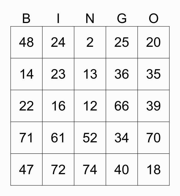 This bingo card has a free space and 75 words: Free!, 1, 2, 3, 4, 5, 6, 7, 8, 9, 10, 11, 13, 14, 15, 16, 17, 18, 19, 20, 21, 22, 23, 24, 25, 26, 27, 28, 29, 30, 31, 32, 33, 34, 35, 36, 37, 38, 39, 40, 41, 42, 43, 44, 45, 46, 47, 48, 49, 50, 51, 52, 53, 54, 55, 56, 57, 58, 59, 60, 61, 62, 63, 64, 65, 66, 67, 68, 69, 70, 71, 72, 73, 74 and 75.
