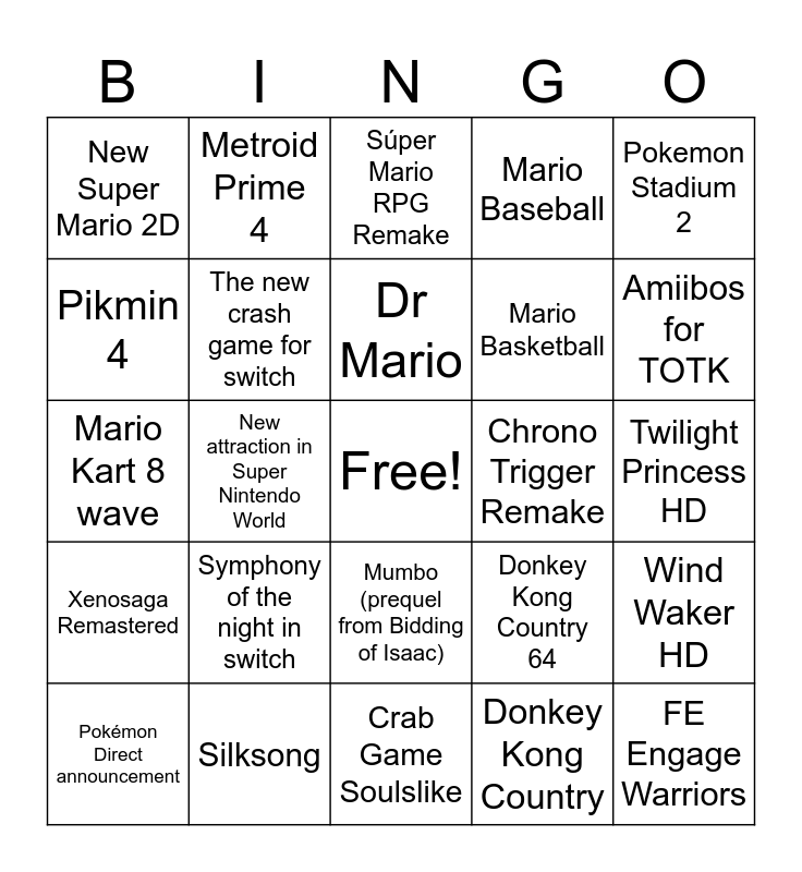 This bingo card has a free space and 24 words: Symphony of the night in switch, Silksong, Dr Mario, Pokémon Direct announcement, Pokemon Stadium 2, New Super Mario 2D, Pikmin 4, Metroid Prime 4, Chrono Trigger Remake, Mumbo (prequel from Bidding of Isaac), Mario Basketball, Mario Kart 8 wave, Donkey Kong Country 64, Wind Waker HD, The new crash game for switch, Donkey Kong Country, Twilight Princess HD, Súper Mario RPG Remake, Amiibos for TOTK, New attraction in Super Nintendo World, FE Engage Warriors, Xenosaga Remastered, Mario Baseball and Crab Game Soulslike.