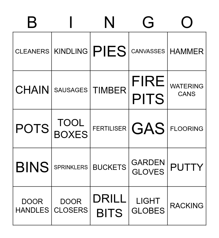 This bingo card has 54 words: BBQ’S, BINS, BRACKETS, BUBBLE WRAP, BUCKETS, CAKES, CANVASSES, CEMENT, CHAIN, CIRCULAR SAW, CLEANERS, COFFEE, DOOR CLOSERS, DOOR HANDLES, DOORS, DRILL BITS, FERTILISER, FIRE PITS, FIRE WOOD, FLOORING, GARDEN GLOVES, GARDEN HOSE, GAS, HAMMER, IRONING BOARDS, KINDLING, KITCHENS, LADDERS, LAUNDRY BASKETS, LIGHT GLOBES, NAILS, PACKING TAPE, PAINT, PEGS, PIES, PLANTS, POTS, PUTTY, RACKING, SAUSAGES, SCREWDRIVER, SHOWER SCREENS, SHRUBS, SILICONE, SPRINKLERS, TAP SETS, TARPAULINS, TILES, TIMBER, TOOL BOXES, WATERING CANS, WHEELBARROWS, WIRE and WRENCH.