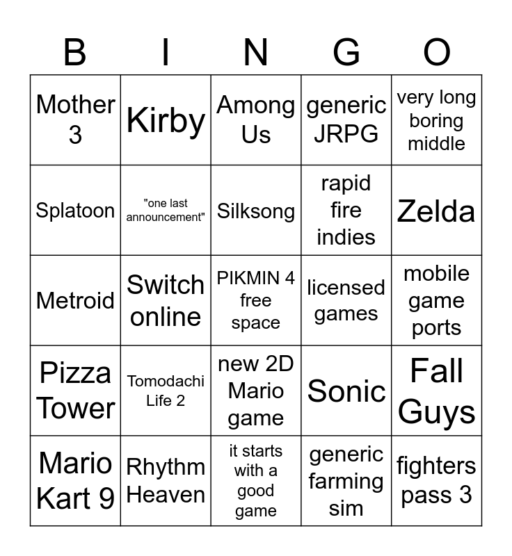 This bingo card has a free space and 24 words: Tomodachi Life 2, Rhythm Heaven, Silksong, Mario Kart 9, very long boring middle, Mother 3, Splatoon, Kirby, licensed games, new 2D Mario game, rapid fire indies, Metroid, Sonic, Fall Guys, "one last announcement", generic farming sim, mobile game ports, Among Us, Zelda, Switch online, fighters pass 3, Pizza Tower, generic JRPG and it starts with a good game.