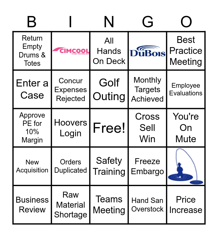This bingo card has 4 images, a free space and 25 words: Business Review, Strategic Growth Meeting, Hoovers Login, Low Margin PEs, Return Empty Drums & Totes, All Hands On Deck, Concur Expenses Rejected, Orders Duplicated, Cross Sell Win, Raw Material Shortage, You're On Mute, Price Increase, Teams Meeting, Hand San Overstock, Employee Evaluations, Rep Makes Presidents Council, Safety Training, New Acquisition, Best Practice Meeting, Approve PE for 10% Margin, Freeze Embargo, CRM Updates, Monthly Targets Achieved, Enter a Case and Golf Outing.