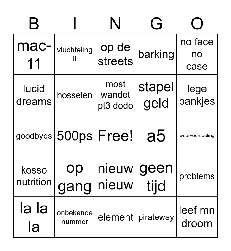 This bingo card has a free space and 24 words: la la la, op gang, most wandet pt3 dodo, pirateway, no face no case, mac-11, vluchteling ll, op de streets, a5, weervoorspeling, goodbyes, hosselen, geen tijd, problems, lucid dreams, onbekende nummer, element, barking, lege bankjes, kosso nutrition, 500ps, nieuw nieuw, stapel geld and leef mn droom.