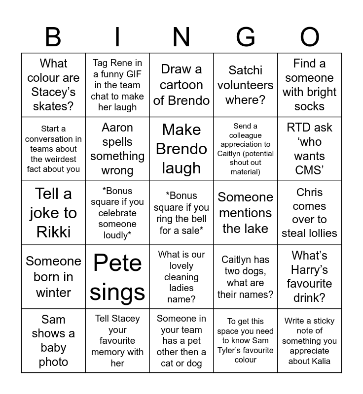 This bingo card has a free space and 24 words: Pete sings, Tell Stacey your favourite memory with her, Make Brendo laugh, Sam shows a baby photo, Find a someone with bright socks, What colour are Stacey’s skates?, Start a conversation in teams about the weirdest fact about you, Tag Rene in a funny GIF in the team chat to make her laugh, Someone mentions the lake, What is our lovely cleaning ladies name?, Send a colleague appreciation to Caitlyn (potential shout out material), Tell a joke to Rikki, Caitlyn has two dogs, what are their names?, What’s Harry’s favourite drink?, Aaron spells something wrong, To get this space you need to know Sam Tyler’s favourite colour, Chris comes over to steal lollies, Draw a cartoon of Brendo, RTD ask ‘who wants CMS’, *Bonus square if you celebrate someone loudly*, Write a sticky note of something you appreciate about Kalia, Someone born in winter, Satchi volunteers where? and Someone in your team has a pet other then a cat or dog.