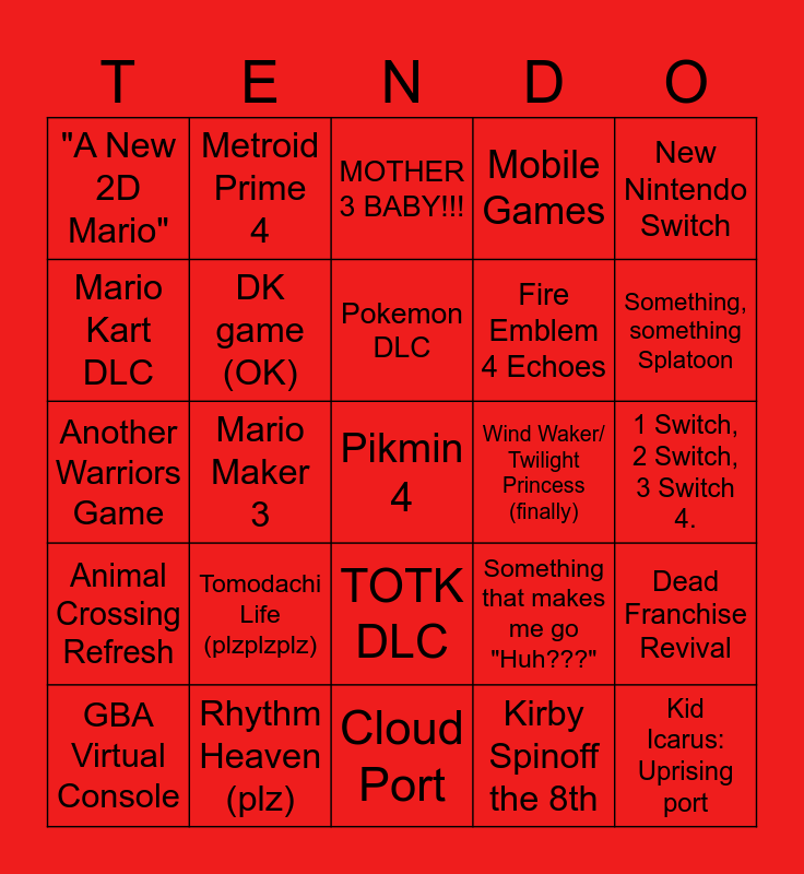 This bingo card has a free space and 24 words: Tomodachi Life (plzplzplz), Rhythm Heaven (plz), Pokemon DLC, GBA Virtual Console, New Nintendo Switch, "A New 2D Mario", Mario Kart DLC, Metroid Prime 4, Wind Waker/ Twilight Princess (finally), TOTK DLC, Fire Emblem 4 Echoes, Another Warriors Game, Something that makes me go "Huh???", Dead Franchise Revival, DK game (OK), Kirby Spinoff the 8th, 1 Switch, 2 Switch, 3 Switch 4., MOTHER 3 BABY!!!, Something, something Splatoon, Mario Maker 3, Kid Icarus: Uprising port, Animal Crossing Refresh, Mobile Games and Cloud Port.