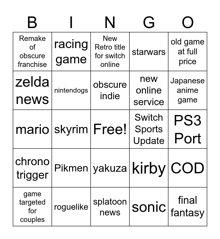 This bingo card has a free space and 24 words: Pikmen, roguelike, obscure indie, game targeted for couples, old game at full price, Remake of obscure franchise, zelda news, racing game, Switch Sports Update, yakuza, new online service, mario, kirby, COD, nintendogs, sonic, PS3 Port, New Retro title for switch online, Japanese anime game, skyrim, final fantasy, chrono trigger, starwars and splatoon news.