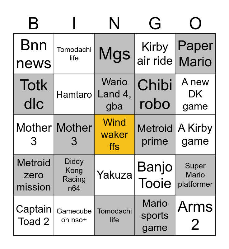 This bingo card has a free space and 24 words: Diddy Kong Racing n64, Gamecube on nso+, Wario Land 4, gba, Captain Toad 2, Paper Mario, Bnn news, Totk dlc, Tomodachi life, Metroid prime, Yakuza, Chibi robo, Mother 3, Banjo Tooie, Super Mario platformer, Hamtaro, Mario sports game, A Kirby game, Mgs, A new DK game, Mother 3, Arms 2, Metroid zero mission, Kirby air ride and Tomodachi life.