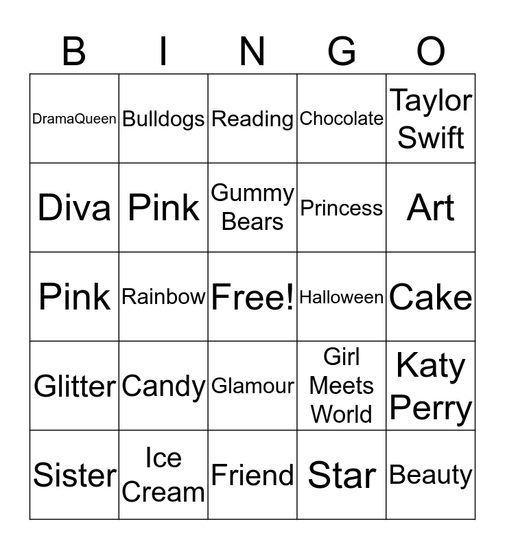 This bingo card has a free space and 32 words: Star, Unicorn, Rainbow, Sparkle, Glitter, Pink, Taylor Swift, Katy Perry, Bulldogs, Crush, Gummy Bears, Reading, Aubrey, January, Halloween, Eleven, Sister, Pink, Glamour, Candy, Girl Meets World, Curly Hair, Cake, Ice Cream, Beauty, Chocolate, Princess, Diva, DramaQueen, Friend, Dance and Art.