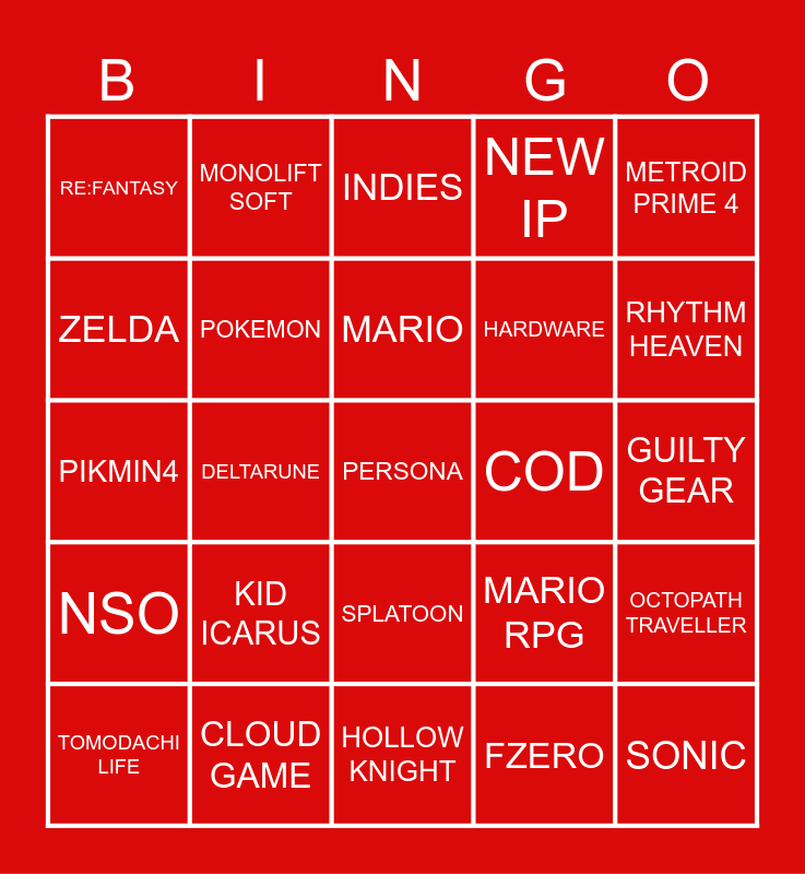 This bingo card has a free space and 24 words: TOMODACHI LIFE, KID ICARUS, MARIO, FZERO, METROID PRIME 4, RE:FANTASY, MONOLIFT SOFT, INDIES, COD, GUILTY GEAR, PIKMIN4, POKEMON, MARIO RPG, OCTOPATH TRAVELLER, ZELDA, CLOUD GAME, HOLLOW KNIGHT, NEW IP, RHYTHM HEAVEN, NSO, DELTARUNE, SPLATOON, HARDWARE and SONIC.