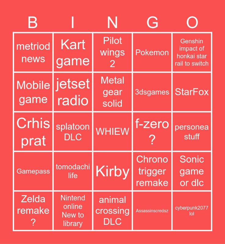 This bingo card has a free space and 29 words: Zelda remake ?, Zelda totk DLC, splatoon DLC, new Mario, metriod news, Pilot wings 2, jetset radio, tomodachi life, f-zero ?, Nintend online New to library, personea stuff, cyberpunk2077 lol, animal crossing DLC, Assassinscredsz, StarFox, Yoshi, Kirby, Gamepass, Genshin impact of honkai star rail to switch, Crhis prat, Chrono trigger remake, Dragon Quest, 3dsgames, Mobile game, Pokemon, Kart game, Sonic game or dlc, Metal gear solid and Pikmin 4.