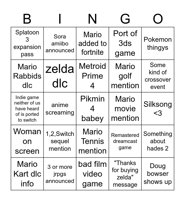 This bingo card has a free space and 24 words: 1,2,Switch sequel mention, 3 or more jrpgs announced, Metroid Prime 4, Mario Kart dlc info, Pokemon thingys, Splatoon 3 expansion pass, Mario Rabbids dlc, Sora amiibo announced, Mario movie mention, Mario Tennis mention, Mario golf mention, Indie game neither of us have heard of is ported to switch, Remastered dreamcast game, Something about hades 2, zelda dlc, "Thanks for buying zelda" message, Silksong <3, Mario added to fortnite, Some kind of crossover event, anime screaming, Doug bowser shows up, Woman on screen, Port of 3ds game and bad film video game.