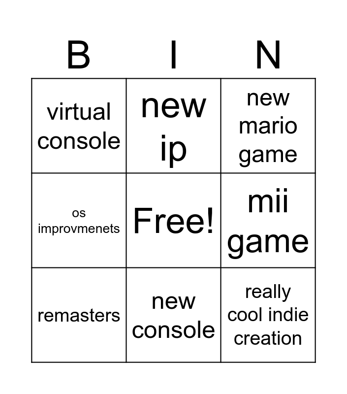 This bingo card has a free space and 8 words: mii game, new mario game, new ip, remasters, virtual console, really cool indie creation, os improvmenets and new console.