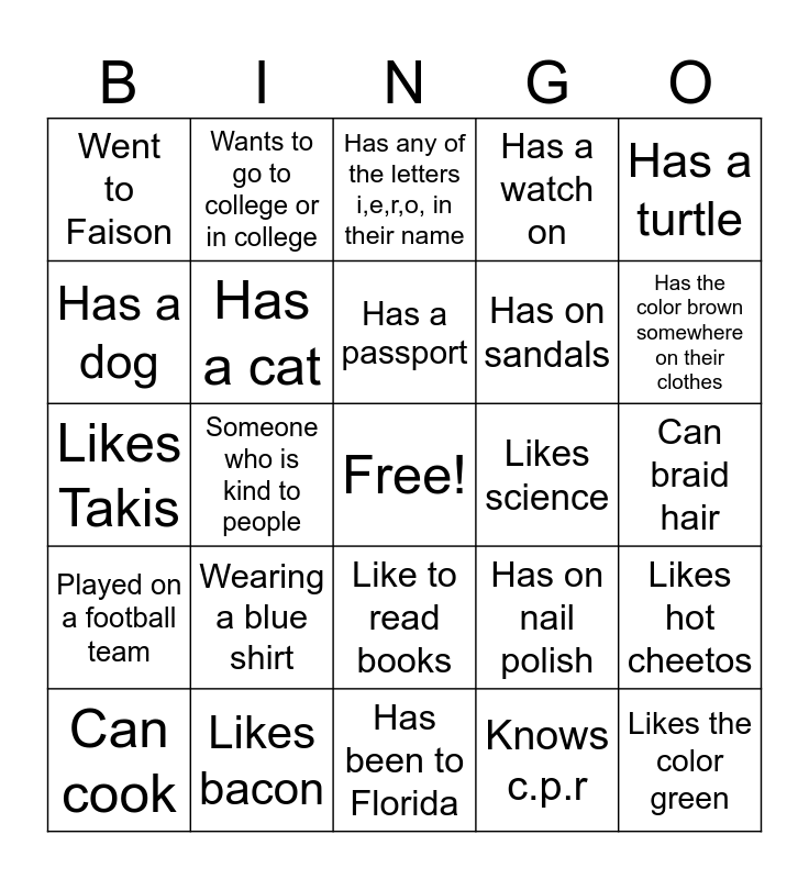 This bingo card has a free space and 24 words: Wearing a blue shirt, Likes bacon, Has a passport, Can cook, Has a turtle, Went to Faison, Has a dog, Wants to go to college or in college, Likes science, Like to read books, Has on sandals, Likes Takis, Has on nail polish, Likes hot cheetos, Has a cat, Knows c.p.r, Can braid hair, Has any of the letters i,e,r,o, in their name, Has the color brown somewhere on their clothes, Someone who is kind to people, Likes the color green, Played on a football team, Has a watch on and Has been to Florida.