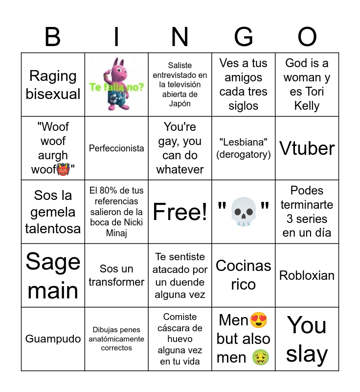 This bingo card has 1 images, a free space and 23 words: Sos un transformer, Dibujas penes anat贸micamente correctos, You're gay, you can do whatever, Guampudo, God is a woman y es Tori Kelly, Raging bisexual, "Woof woof aurgh woof馃懝", "馃拃", Te sentiste atacado por un duende alguna vez, "Lesbiana" (derogatory), Sos la gemela talentosa, Cocinas rico, Robloxian, Perfeccionista, Men馃槏 but also men 馃あ, Podes terminarte 3 series en un d铆a, Saliste entrevistado en la televisi贸n abierta de Jap贸n, Vtuber, El 80% de tus referencias salieron de la boca de Nicki Minaj, You slay, Sage main, Ves a tus amigos cada tres siglos and Comiste c谩scara de huevo alguna vez en tu vida.