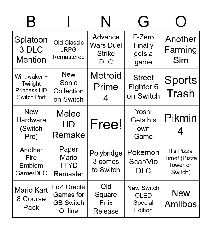 This bingo card has a free space and 24 words: Paper Mario TTYD Remaster, LoZ Oracle Games for GB Switch Online, Metroid Prime 4, Mario Kart 8 Course Pack, Another Farming Sim, Splatoon 3 DLC Mention, Windwaker + Twilight Princess HD Switch Port, Old Classic JRPG Remastered, Yoshi Gets his own Game, Polybridge 3 comes to Switch, Street Fighter 6 on Switch, New Hardware (Switch Pro), Pokemon Scar/Vio DLC, It's Pizza Time! (Pizza Tower on Switch), New Sonic Collection on Switch, New Switch OLED Special Edition, Pikmin 4, Advance Wars Duel Strike DLC, Sports Trash, Melee HD Remake, New Amiibos, Another Fire Emblem Game/DLC, F-Zero Finally gets a game and Old Square Enix Release.