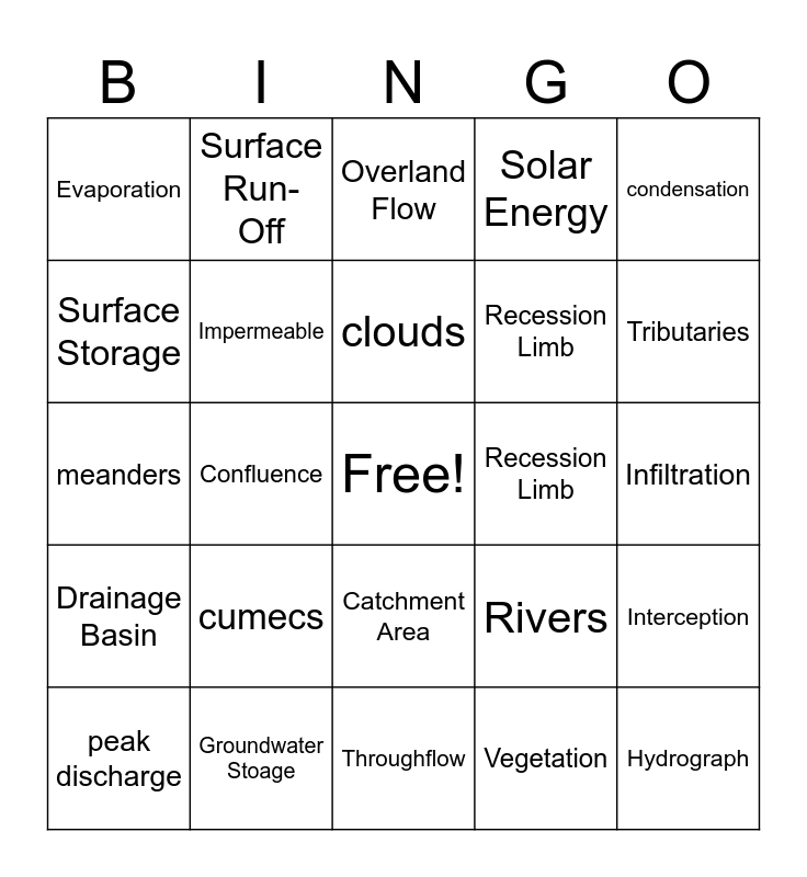 This bingo card has a free space and 24 words: peak discharge, cumecs, clouds, Vegetation, condensation, Evaporation, Surface Run-Off, Overland Flow, Recession Limb, Infiltration, meanders, Impermeable, Rivers, Interception, Surface Storage, Groundwater Stoage, Throughflow, Solar Energy, Tributaries, Drainage Basin, Confluence, Catchment Area, Recession Limb and Hydrograph.