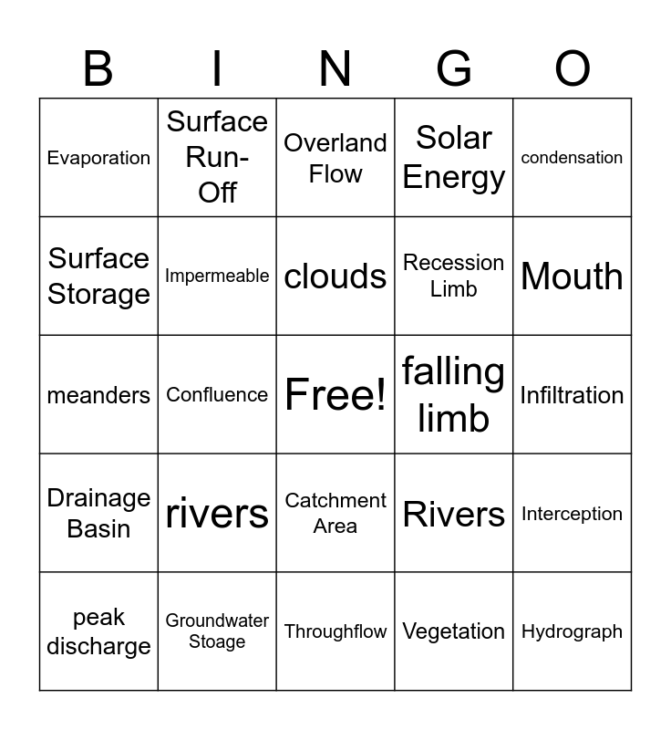 This bingo card has a free space and 24 words: peak discharge, rivers, clouds, Vegetation, condensation, Evaporation, Surface Run-Off, Overland Flow, falling limb, Infiltration, meanders, Impermeable, Rivers, Interception, Surface Storage, Groundwater Stoage, Throughflow, Solar Energy, Mouth, Drainage Basin, Confluence, Catchment Area, Recession Limb and Hydrograph.