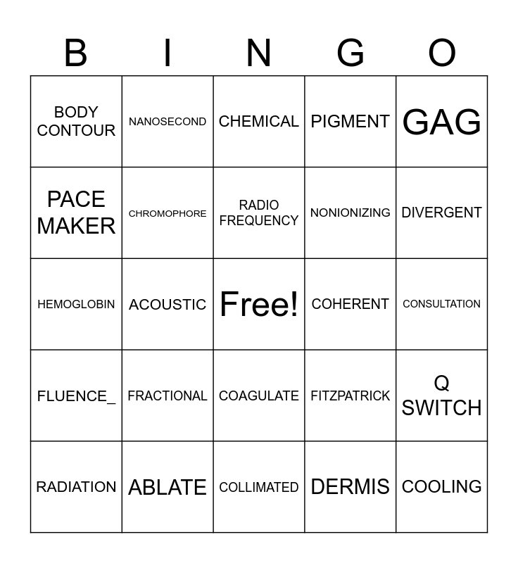 This bingo card has a free space and 30 words: ABLATE, ABSORPTION, ACOUSTIC, ANAGEN, BODY CONTOUR, CHEMICAL, CHROMOPHORE, COAGULATE, COHERENT, COLLIMATED, CONSULTATION, COOLING, DERMIS, DISINFECT, DIVERGENT, EPIDERMIS, FITZPATRICK, FLUENCE_, FRACTIONAL, GAG, HEMOGLOBIN, LESION, NANOSECOND, NONIONIZING, PACE MAKER, PIGMENT, Q SWITCH, RADIATION, RADIO FREQUENCY and REFLECTION.