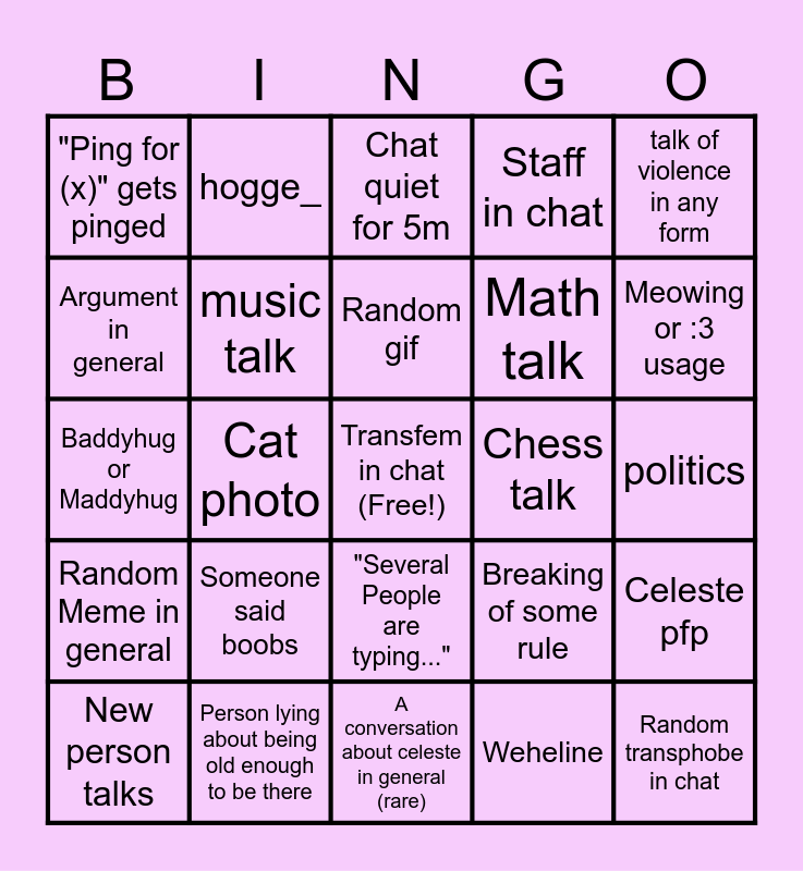 This bingo card has a free space and 24 words: Someone said boobs, Person lying about being old enough to be there, Random gif, New person talks, talk of violence in any form, "Ping for (x)" gets pinged, Argument in general, hogge_, Chess talk, "Several People are typing...", Math talk, Baddyhug or Maddyhug, Breaking of some rule, Celeste pfp, music talk, Weheline, politics, Chat quiet for 5m, Meowing or :3 usage, Cat photo, Random transphobe in chat, Random Meme in general, Staff in chat and A conversation about celeste in general (rare).