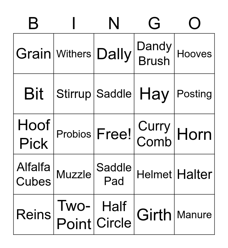 This bingo card has a free space and 24 words: Muzzle, Two-Point, Saddle, Reins, Hooves, Grain, Bit, Withers, Curry Comb, Saddle Pad, Hay, Hoof Pick, Helmet, Halter, Stirrup, Girth, Horn, Dally, Posting, Probios, Manure, Alfalfa Cubes, Dandy Brush and Half Circle.