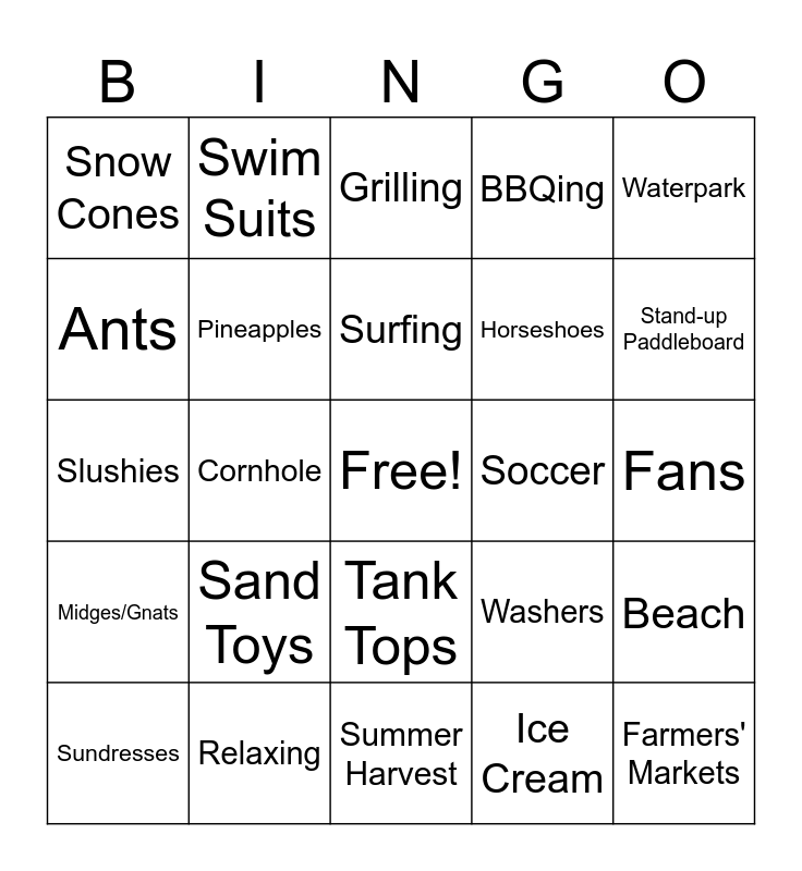 This bingo card has a free space and 110 words: Baseball, Softball, Soccer, Tennis, Golf, Cycling, NASCAR, Water Polo, Basketball, Cold Beer, White Wine, Seltzers, Lemonade, Iced Tea, Water, Sangria, Slushies, Frozen Smoothies, Lake Days, Floating the River, Beach, Canoeing, Rafting, Swimming, Pool, Surfing, Waterpark, Coast, Fishing, Snorkeling, Stand-up Paddleboard, BBQing, Grilling, Picnics, Music Festivals, Farmers' Markets, Town Festivals, Camping, Relaxing, Gardening, Frisbee, Ladder Golf, Horseshoes, Cornhole, Washers, Fireworks, Visit Zoo, Skateboarding, Rollerblading, Outdoor yoga, Hiking, Summer Fruits, Ice Cream, Popsicles, Hot Dogs, Burgers, Watermelon, Frozen Grapes, Strawberries, Pineapples, Snow Cones, Sunscreen, Sunglasses, Sandcastles, Shells, Sand Toys, Deck Chairs, Beach Chairs, Flip Flops, Beach Ball, Beach Umbrellas, Wide Brim Hat, Swim Suits, Beach Towels, Pool Floats, Lifeguards, HOT Weather, Fans, Air Conditioner, Humidity, Sunny, Monsoon, Hurricanes, Heat Wave, Heat Index, Sun Burn, Lighting Bugs/Fireflies, Mosquitos, Cicadas, Bees, Crickets, Ants, Butterflies, Midges/Gnats, Dog Days, Summer Solstice, No School, Holiday, Vacations, Summer Harvest, Amusement Park, Hammock, Swings, Sundresses, Tank Tops, Hibiscus, Shasta Daisy, Tiger Lillies, Dandelions and Sunflowers.