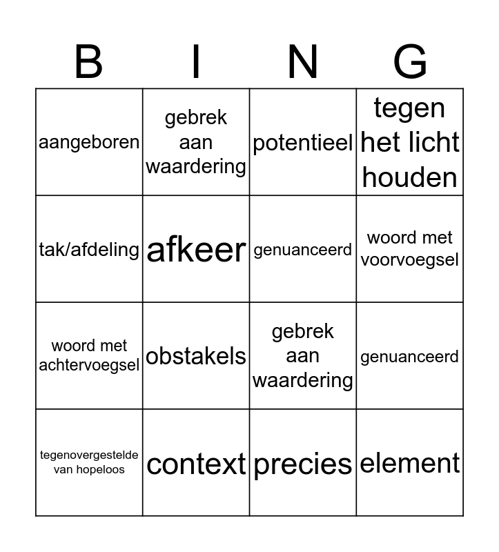 This bingo card has a free space and 15 words: tegenovergestelde van hopeloos, element, potentieel, aangeboren, woord met voorvoegsel, tak/afdeling, obstakels, precies, afkeer, woord met achtervoegsel, genuanceerd, tegen het licht houden, genuanceerd, gebrek aan waardering and context.