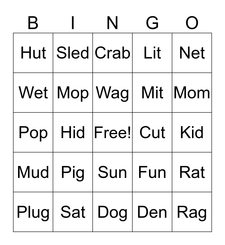 This bingo card has a free space and 24 words: Pig, Sat, Wag, Plug, Net, Hut, Wet, Sled, Cut, Sun, Mit, Pop, Fun, Rat, Mop, Den, Kid, Crab, Mom, Hid, Rag, Mud, Lit and Dog.