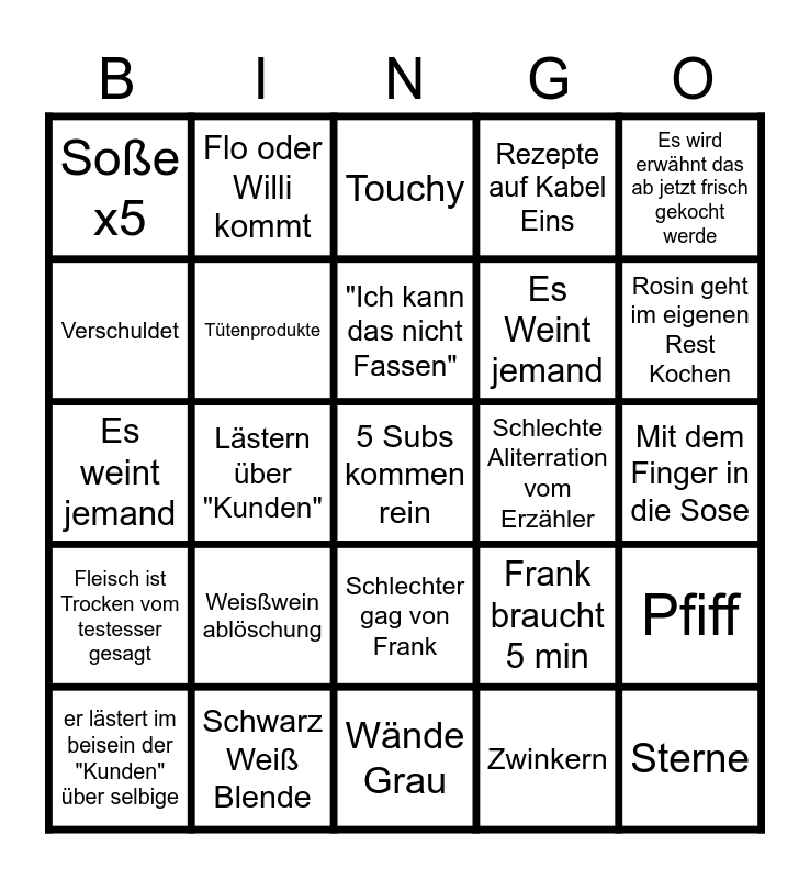 This bingo card has a free space and 24 words: Weisßwein ablöschung, Schwarz Weiß Blende, "Ich kann das nicht Fassen", er lästert im beisein der "Kunden" über selbige, Es wird erwähnt das ab jetzt frisch gekocht werde, Soße x5, Verschuldet, Flo oder Willi kommt, Schlechte Aliterration vom Erzähler, Schlechter gag von Frank, Es Weint jemand, Es weint jemand, Frank braucht 5 min, Pfiff, Tütenprodukte, Zwinkern, Mit dem Finger in die Sose, Touchy, Rosin geht im eigenen Rest Kochen, Lästern über "Kunden", Sterne, Fleisch ist Trocken vom testesser gesagt, Rezepte auf Kabel Eins and Wände Grau.