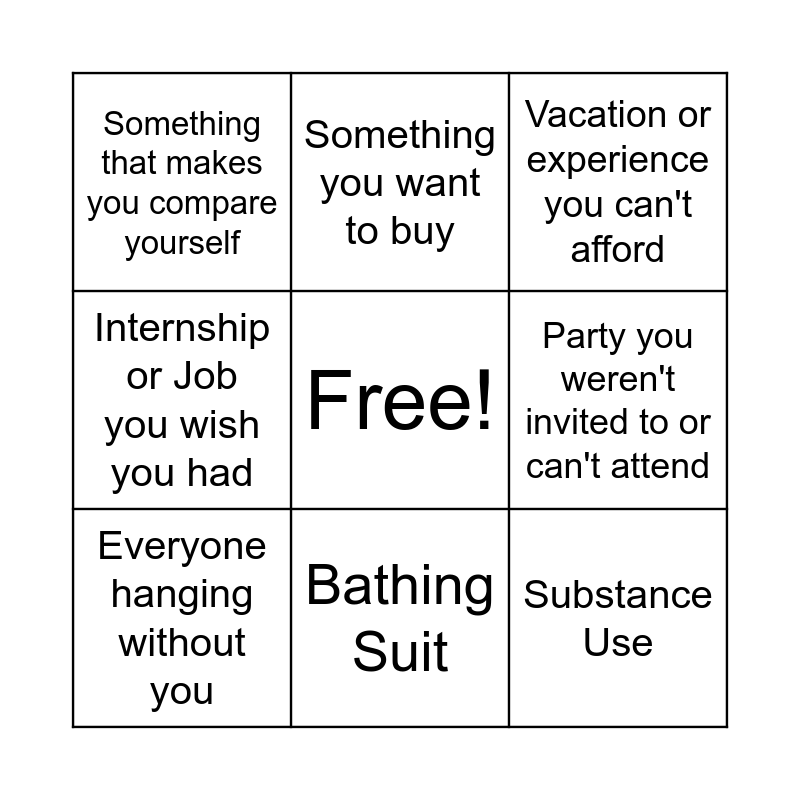 This bingo card has a free space and 11 words: Relationship goals you haven't yet met, Bathing Suit, Substance Use, Everyone hanging without you, Something you want to buy, Vacation or experience you can't afford, Party you weren't invited to or can't attend, Diet/food/body advice, Internship or Job you wish you had, Something that makes you compare yourself and Gives You An Ick.