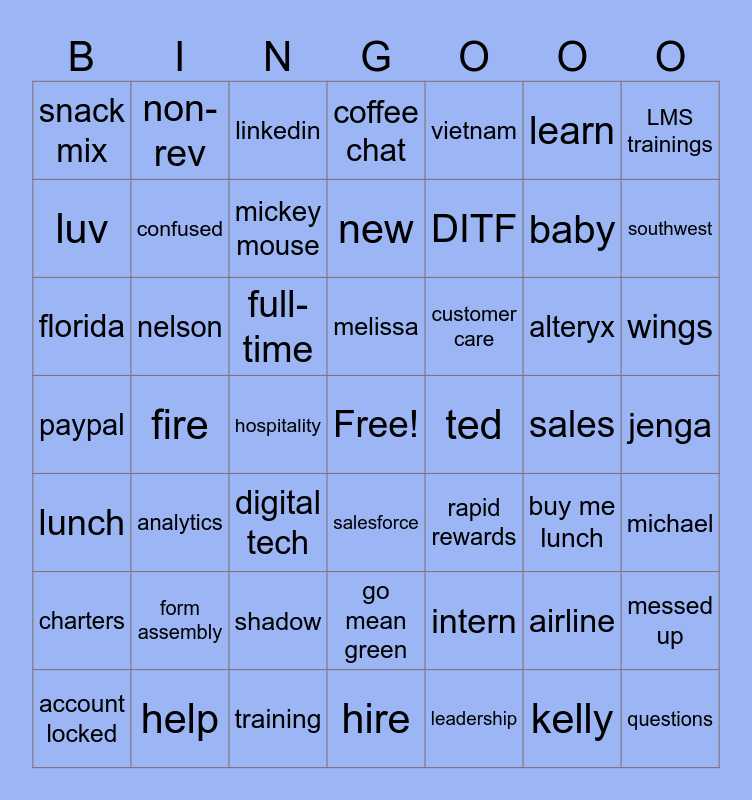 This bingo card has a free space and 48 words: intern, baby, hire, fire, full-time, jenga, non-rev, help, learn, salesforce, LMS trainings, coffee chat, alteryx, customer care, charters, sales, luv, southwest, airline, vietnam, DITF, hospitality, snack mix, confused, messed up, mickey mouse, wings, account locked, melissa, nelson, kelly, ted, michael, form assembly, paypal, rapid rewards, buy me lunch, florida, digital tech, shadow, lunch, questions, linkedin, training, new, go mean green, analytics and leadership.