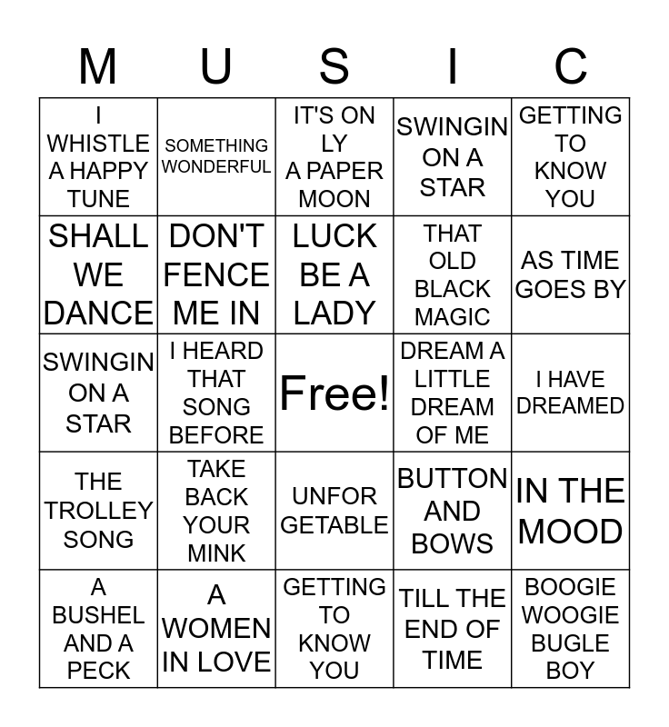 This bingo card has a free space and 24 words: TAKE BACK YOUR MINK, A WOMEN IN LOVE, LUCK BE A LADY, A BUSHEL AND A PECK, GETTING TO KNOW YOU, I WHISTLE A HAPPY TUNE, SHALL WE DANCE, SOMETHING WONDERFUL, DREAM A LITTLE DREAM OF ME, UNFOR GETABLE, THAT OLD BLACK MAGIC, SWINGIN ON A STAR, BUTTON AND BOWS, IN THE MOOD, DON'T FENCE ME IN, TILL THE END OF TIME, I HAVE DREAMED, IT'S ONLY A PAPER MOON, AS TIME GOES BY, I HEARD THAT SONG BEFORE, BOOGIE WOOGIE BUGLE BOY, THE TROLLEY SONG, SWINGIN ON A STAR and GETTING TO KNOW YOU.