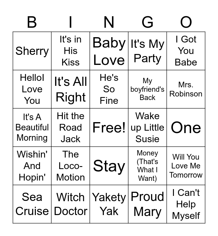 This bingo card has a free space and 75 words: All I have to Do Is Dream, All shook up, Baby Love, Blue Moon, Bread And Butter, Breaking Up Is Hard to Do, Chapel Of Love, Downtown, Dream Baby, Fever, For Your Love, Hang on Sloopy, He's So Fine, HelloI Love You, Hey Baby, Hit the Road Jack, House of the Rising Sun, I Can't Help Myself, I Fall To Pieces, I Got You Babe, I Want To Hold Your Hand, It's A Beautiful Morning, It's All Right, It's in His Kiss, It's My Party, It's Not Unusual, Johnny Be Good, Last Kiss, Leader Of The Pack, Lollipop, Louis Louis, Love Me Do, Mama Said, Money (That's What I Want), Mrs. Robinson, My boyfriend's Back, My Guy, Oh, Pretty Woman, One, Proud Mary, Puppy Love, Put Your Head On My Shoulder, Right Back Where We Started From,, Rock-in Robin, Runaround Sue, School Day, Sea Cruise, Sherry, Spinning Wheel, Spirit in the Sky, Stand by Me, Stay, Stayin' Alive, SugarSugar, Surf City, Surfin Safari, Sweet Caroline, Tequila, That The Way I Like It, The Candy Man, The Loco-Motion, The Twist, The Way You Do The Things You Do, Til I Kissed you, Twist and Shout, Wake up Little Susie, Walk Like a Man, What The World Needs Now Is Love, Where Did Our Love Go, Will You Love Me Tomorrow, Wishin' And Hopin', Witch Doctor, Y.M.C.A., Yakety Yak and You're No Good.