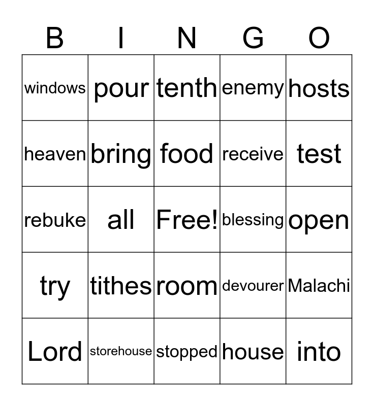 This bingo card has a free space and 24 words: tithes, storehouse, food, Lord, hosts, windows, heaven, pour, blessing, room, receive, rebuke, devourer, Malachi, bring, house, open, tenth, test, all, into, try, enemy and stopped.