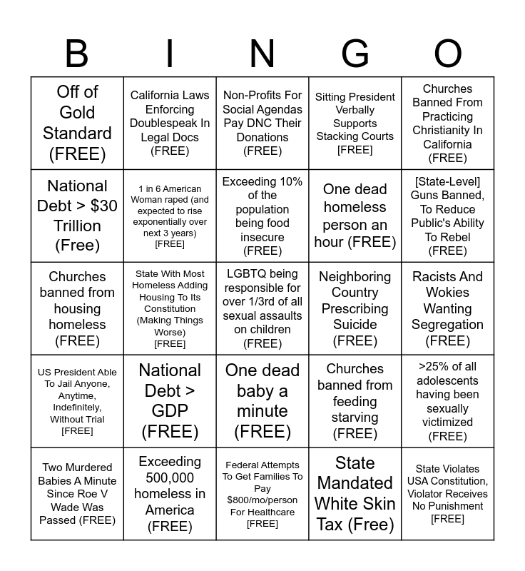 This bingo card has a free space and 24 words: National Debt > GDP (FREE), Exceeding 500,000 homeless in America (FREE), Exceeding 10% of the population being food insecure (FREE), Two Murdered Babies A Minute Since Roe V Wade Was Passed (FREE), Churches Banned From Practicing Christianity In California (FREE), Off of Gold Standard (FREE), National Debt > $30 Trillion (Free), California Laws Enforcing Doublespeak In Legal Docs (FREE), Neighboring Country Prescribing Suicide (FREE), One dead baby a minute (FREE), One dead homeless person an hour (FREE), Churches banned from housing homeless (FREE), Churches banned from feeding starving (FREE), >25% of all adolescents having been sexually victimized (FREE), 1 in 6 American Woman raped (and expected to rise exponentially over next 3 years) [FREE], State Mandated White Skin Tax (Free), Racists And Wokies Wanting Segregation (FREE), Non-Profits For Social Agendas Pay DNC Their Donations (FREE), [State-Level] Guns Banned, To Reduce Public's Ability To Rebel (FREE), State With Most Homeless Adding Housing To Its Constitution (Making Things Worse) [FREE], State Violates USA Constitution, Violator Receives No Punishment [FREE], US President Able To Jail Anyone, Anytime, Indefinitely, Without Trial [FREE], Sitting President Verbally Supports Stacking Courts [FREE] and Federal Attempts To Get Families To Pay $800/mo/person For Healthcare [FREE].