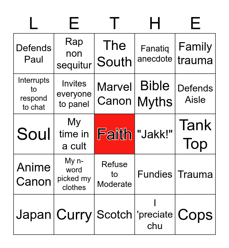 This bingo card has a free space and 24 words: My n-word picked my clothes, Curry, Marvel Canon, Japan, Family trauma, Defends Paul, Interrupts to respond to chat, Rap non sequitur, "Jakk!", Refuse to Moderate, Bible Myths, Soul, Fundies, Trauma, Invites everyone to panel, I 'preciate chu, Tank Top, The South, Defends Aisle, My time in a cult, Cops, Anime Canon, Fanatiq anecdote and Scotch.