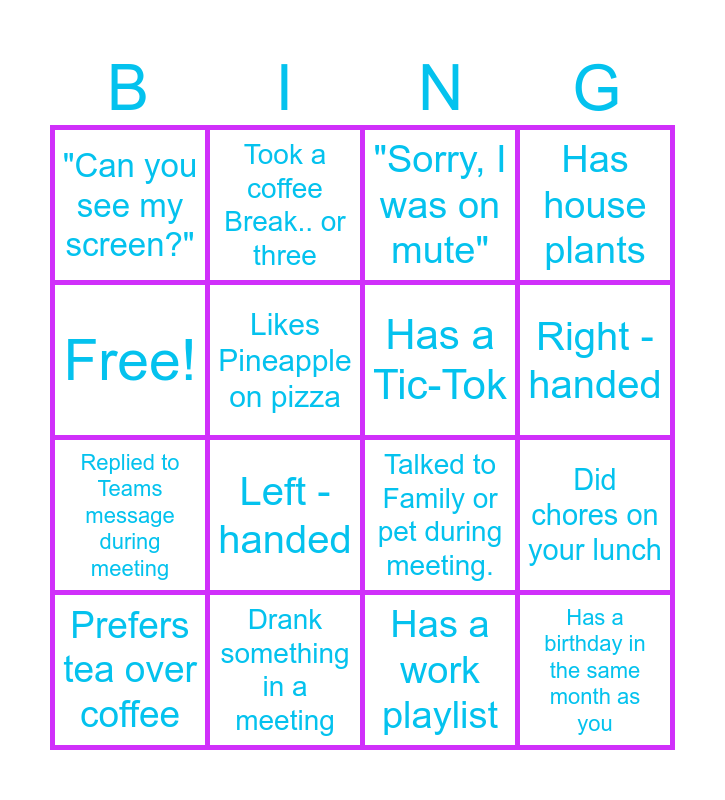 This bingo card has 16 words: Drank something in a meeting, Did chores on your lunch, "Sorry, I was on mute", "Can you see my screen?", Replied to Teams message during meeting, Took a coffee Break.. or three, Talked to Family or pet during meeting., Has a work playlist, Free!, Likes Pineapple on pizza, Prefers tea over coffee, Has house plants, Left - handed, Right - handed, Has a Tic-Tok and Has a birthday in the same month as you.