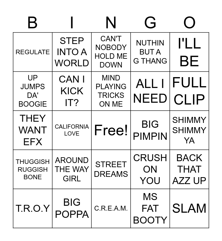 This bingo card has a free space and 30 words: BIG POPPA, OPP, CALIFORNIA LOVE, AMBITIONZ AZ A RIDAH, REGULATE, CAN'T NOBODY HOLD ME DOWN, CAN I KICK IT?, STREET DREAMS, BIG PIMPIN, C.R.E.A.M., SHIMMY SHIMMY YA, SLAM, MS FAT BOOTY, DA ART OF STORYTELLIN PART 1, FULL CLIP, VIVRANT THING, CRUSH ON YOU, THUGGISH RUGGISH BONE, AROUND THE WAY GIRL, I'LL BE, THEY WANT EFX, INSANE IN THE BRAIN, STEP INTO A WORLD, ALL I NEED, UP JUMPS DA' BOOGIE, NUTHIN BUT A G THANG, BACK THAT AZZ UP, T.R.O.Y, MIND PLAYING TRICKS ON ME and STILL NOT A PLAYER.