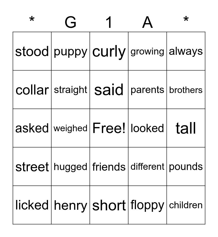 This bingo card has a free space and 30 words: henry, mudge, weighed, drooled, stood, curly, straight, friends, looked, short, tall, children, floppy, pointed, brothers, sisters, different, street, hugged, always, asked, street, puppy, parents, collar, growing, pounds, licked, said and searched.
